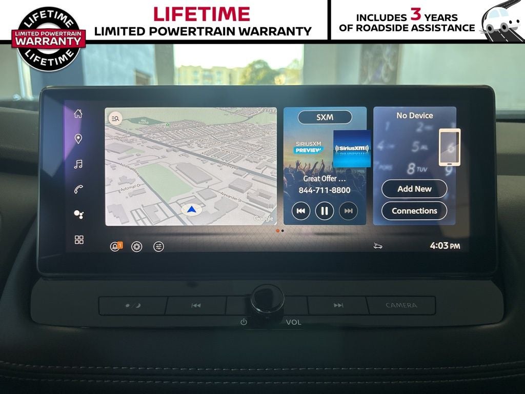 - Radio: AM/FM NissanConnect w/Navigation -inc: SiriusXM 360L, hybrid radio, enhanced voice recognition (one shot VDE, natural language understanding), Active Noise Cancellation, wireless Apple CarPlay, wireless Android Auto, 12.3" color HD display, Bluetooth®, 2 front USB type-C, Wi-Fi hotspot, Alexa Built-In, Google built-in: Google Assistant, Play Store, maps, data, NissanConnect Services powered by SiriusXM, SiriusXM Traffic and SiriusXM Travel Link